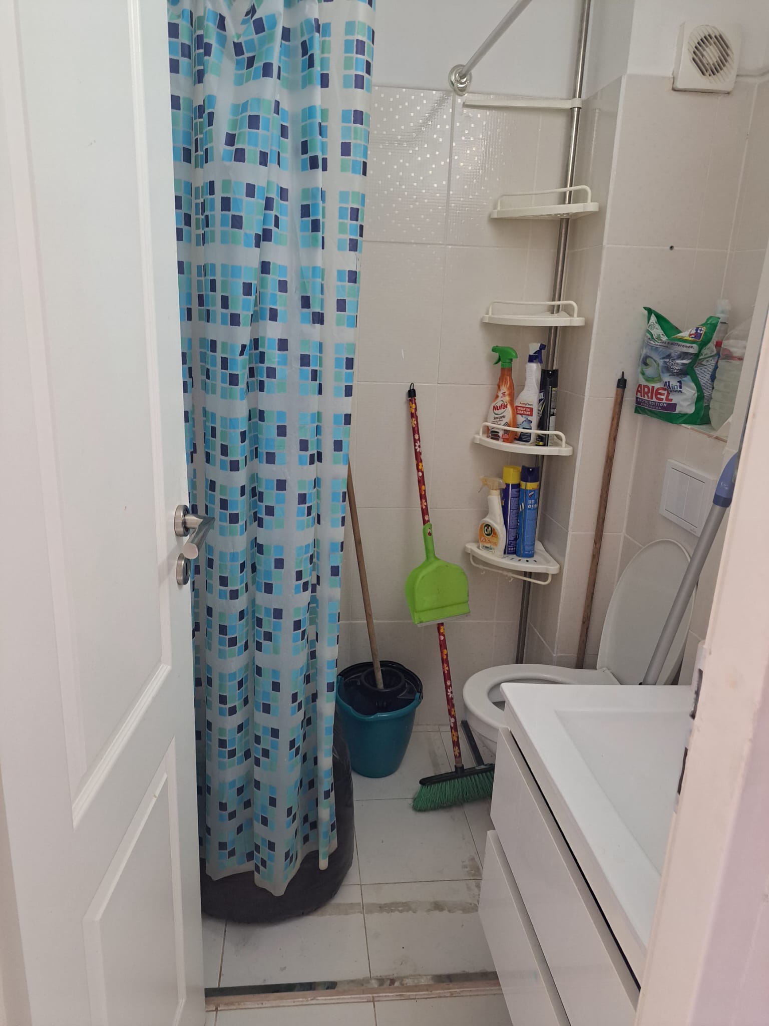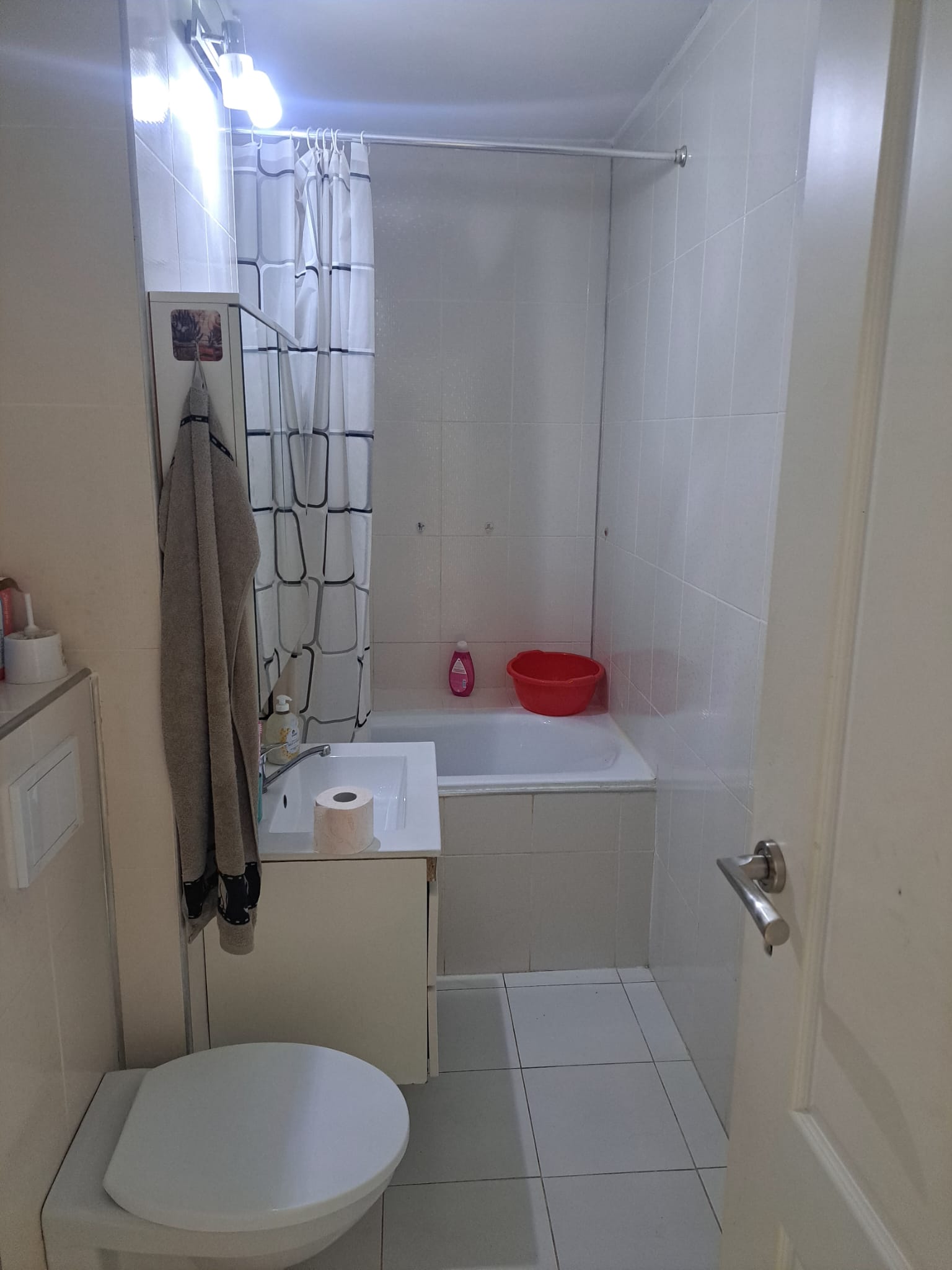 O baie principală cu cadă, WC și chiuvetă + grup sanitar de serviciu cu toaletă și chiuvetă;